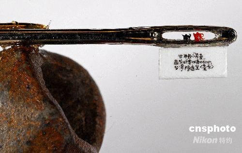 6月13日,臺灣著名微雕家陳逢顯攜其“世界最小茶壺”系列來北京進行文化訪問。圖為陳逢顯用黑翡翠和紅翡翠石粉末雕刻的世界最小茶壺,置于針孔中。中新社發 陳立宇 攝