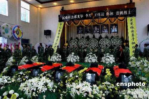 6月13日,四川大地震救援中失事直升機遇難機組人員遺體告別儀式在成都市殯儀館舉行,來自軍方及社會各界的人士紛紛前來送別英雄。中新社發 劉新 攝