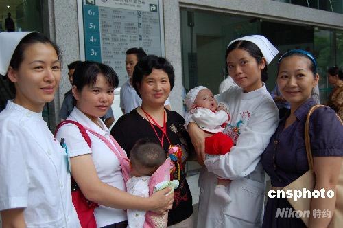 6月15日下午,在廣西治療的部分四川地震傷員康復出院,當晚共有五十五名傷員乘坐火車返回家鄉四川。圖為在廣西人民醫院治療的四川地震小傷員、三個月的羌族小姑娘母牽琦康復出院,愛心媽媽們和小牽琦合影告別。在廣西治療期間,當地六名正處在哺乳期的“愛心媽媽”為她喂奶,一名未婚的護士成為她的干媽。中新社發 劉萬強 攝