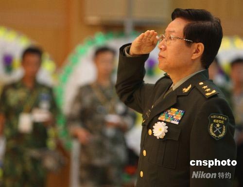 成都軍區政委張海陽中將在追悼大會上向五位烈士敬禮。中新社發 賈國榮 攝