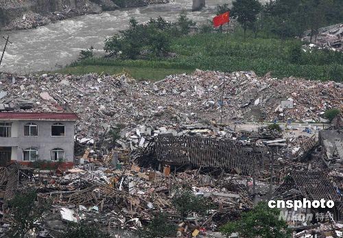 四川汶川大地震嚴重毀壞映秀鎮,將映秀鎮小學幾乎全部摧毀為廢墟。中新社發 賈國榮 攝