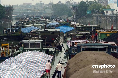 6月18日,300多艘駁殼貨船在京杭大運河杭州段滯留。據了解,從6月17日開始,浙江省迎來了入梅來的第三次強降雨。浙江省防汛指揮部辦已啟動防汛Ⅲ級應急響應。強降雨導致錢塘江流速過快,為確保京杭大運河船只行船安全,京杭大運河杭州段通往錢塘江的杭州三堡船閘于于當日關閉,300多艘船舶被堵滯留。中新社發 施健學 攝