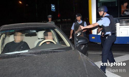 六月十九日夜,北京豐臺警方舉行奧運安保演練,進行設卡攔截演習。五十余輛警車迅速到達進出北京方向和相關環線的各個路口執行攔截任務,并成功將“犯罪嫌疑人”截獲。中新社發 楊陽 攝