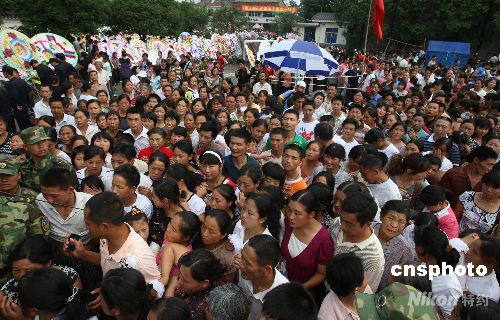 汶川地震災(zāi)區(qū)四川都江堰市胥家鎮(zhèn),在抗震救災(zāi)中犧牲的武文斌的簡易靈堂前擠滿了數(shù)萬前來悼念的民眾。中新社發(fā) 曾憲平 攝