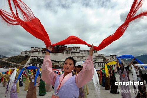 6月21日,奧運火炬在西藏拉薩進行傳遞。在布達拉宮廣場舉行的奧運史上首次熔火儀式現場,能歌善舞的藏族少女揮舞哈達迎接奧運火炬。中新社發 廖攀 攝