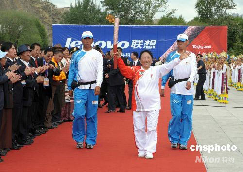 6月21日,奧運圣火在西藏拉薩進行傳遞,著名藏族老歌唱家才旦卓瑪高擎“祥云”火炬在布達拉宮廣場跑向終點。 中新社發 廖攀 攝