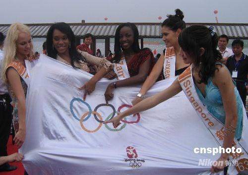 6月23日,參加一年一度世界休閑小姐總決賽的佳麗們來到蘇州中國珍珠寶石城舉行巡游活動。在珍珠湖畔,佳麗們親手穿線串珠,共同制作了由20888顆淡水珍珠匯成的奧運五環旗,并奉上“預祝2008北京奧運會舉辦成功”的美好祝愿。 中新社發 黃瑩 攝
