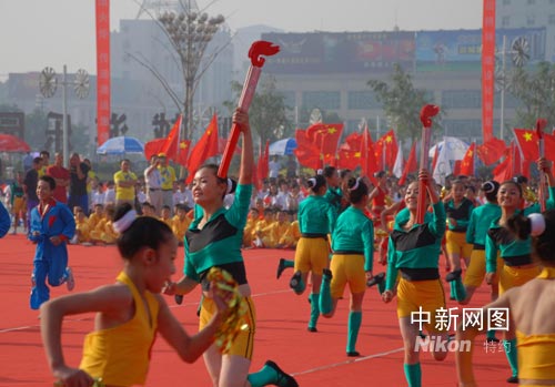6月25日上午,奧運火炬在山西運城傳遞。火炬傳遞前,熱烈精彩的祝賀表演。張雷杰 攝