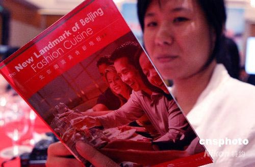 在頒獎典禮上中英文雙語《北京潮流美食新地標》一書舉行首發(fā)式,此書成為奧運期間國內(nèi)外游客、運動員和記者們在京城的美食就餐指南。中新社發(fā) 錢興強 攝