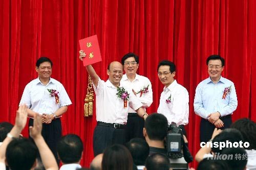 6月28日,北京奧運會主體育場“鳥巢”正式落成,北京市副市長、北京市“2008”工程指揮部指揮陳剛(右二)在落成典禮上致詞,并向國家體育場有限責任公司董事長李愛慶(左二)交付竣工驗收合格證書。中新社發 盛佳鵬 攝