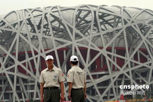 6月28日,兩位安保人員在北京奧運(yùn)會主體育場——國家體育場(“鳥巢”)外巡視。當(dāng)日,“鳥巢”正式落成。中新社發(fā) 盛佳鵬 攝