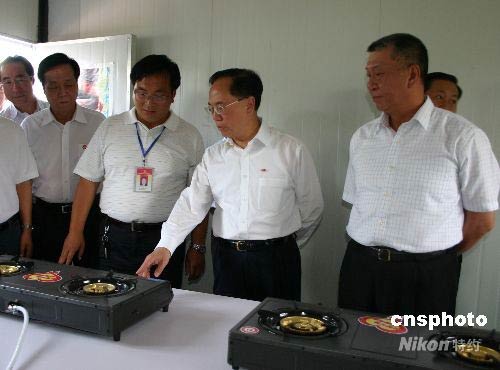 香港特首曾蔭權、澳門特首何厚鏵一行在四川省副省長魏宏陪同下,抵達地震重災區彭州市小漁洞鎮大楠社區安置點,慰問當地受災群眾,參觀安置房、公共廚房和安置點內的娛樂設施,并體驗了公共廁所。中新社發 霍潺 攝