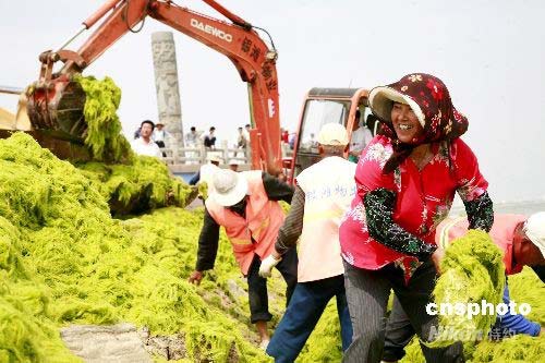 圖為乳山市民眾在近海清理海灘與近海的滸苔。自6月28日以來,在繼奧帆賽舉辦地青島近海出現(xiàn)大量漂浮海藻——滸苔后,距青島僅一個多小時車程的乳山市近海也現(xiàn)了大量滸苔,雖然這些滸苔無毒無污染,但仍然引起乳山市的高度關注,目前乳山近海附近三千余民眾正有序地清理著近海滸苔,截止發(fā)稿時該市已清理滸苔二萬余噸。中新社發(fā) 劉國賢 攝