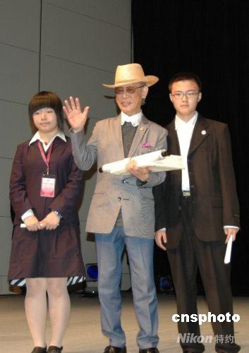 八十九歲高齡的日本漫畫家協會理事長柳瀨 嵩向來自南山中學的學生代表勾梁丁、蘇思宇同學表達深切的問候,并接受了兩位同學的禮物--南山中學的畫冊。中新社發 朱沿華 攝