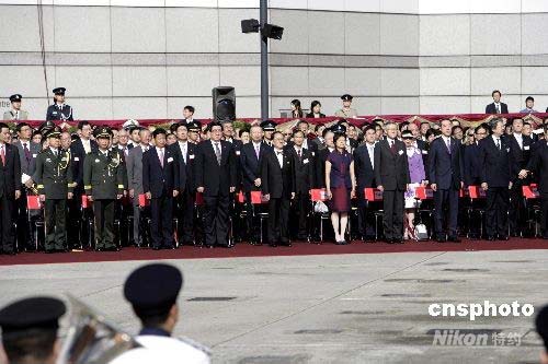 香港特區行政長官曾蔭權及特區政府官員、中央駐港聯絡辦公室、外交部駐港特派員公署、駐港部隊及眾多民眾參加升旗儀式。中新社發 王麗南 攝