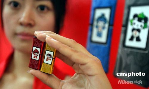 七月二日,北京2008年奧運特許商品奧運吉祥物電子紀(jì)念章、聯(lián)想火炬閃存盤等正式推向市場。特別是聯(lián)想奧運吉祥物閃存盤由于價格適中、實用性強,一上市就受到消費者的喜愛。 中新社發(fā) 任海霞 攝