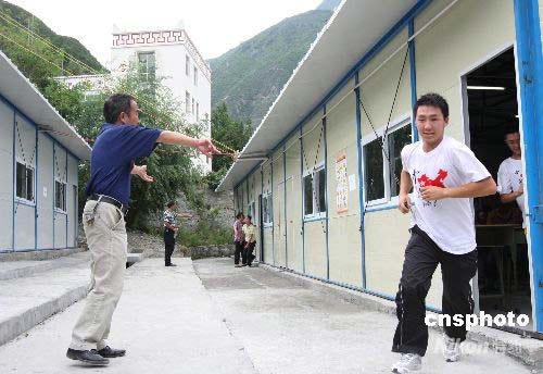理縣中學(xué)高考考點的監(jiān)考老師正在指揮學(xué)生進行余震緊急疏散演習(xí)。中新社發(fā) 黃榮 攝