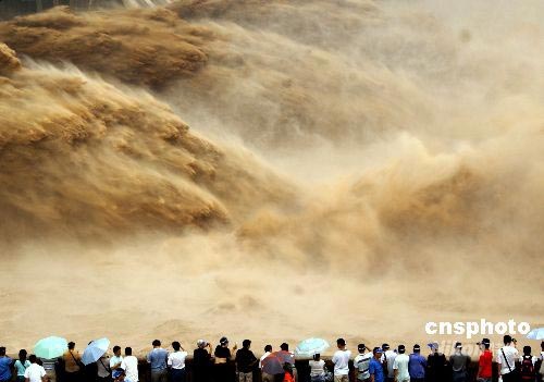 7月4日從小浪底建管局獲悉,小浪底水庫自7月3日6時(shí)開始按1500立方米/秒控泄,這標(biāo)志著小浪底水庫2008年汛前調(diào)水調(diào)沙中所承擔(dān)的任務(wù)已經(jīng)完成。此次調(diào)水調(diào)沙,小浪底水庫下泄水量約40.3億立方米,水庫補(bǔ)水約28億立方米。小浪底水庫水位由調(diào)水調(diào)沙開始時(shí)245.24米回落至調(diào)水調(diào)沙結(jié)束時(shí)222.76米。圖為6月23日、29日小浪底水庫調(diào)水調(diào)沙時(shí)的情景。中新社發(fā) 平白 攝