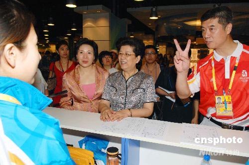 圖為全國人大常委會副委員長、北京奧組委副主席陳至立參觀主新聞中心記者工作區(qū)。 中新社發(fā) 陳文 攝