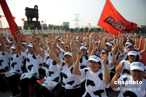 7月8日,奧運火炬在內(nèi)蒙古呼和浩特市進行傳遞。在傳遞起點的民族團結(jié)寶鼎廣場,內(nèi)蒙古民眾身穿花斑奶牛服裝迎接祥云火炬。中新社發(fā) 廖攀 攝
