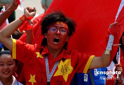 7月8日,奧運火炬在內蒙古呼和浩特傳遞,一名青年裝束紅火為奧運助威加油。 中新社發(fā) 廖攀 攝