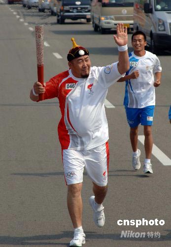 7月8日,奧運火炬在呼和浩特傳遞。圖為第46棒火炬手全國摔交冠軍沙那順格日勒傳遞火炬。中新社發 廖攀 攝