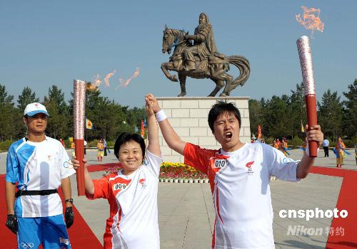 7月9日,奧運火炬在內蒙古鄂爾多斯進行傳遞。傳遞起跑儀式在成吉思汗陵前舉行,火炬手李霽、王恒在成吉思汗雕像前交接火炬。中新社發 廖攀 攝