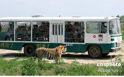 7月10日,在哈爾濱的東北虎林園,一只東北虎與坐在游覽車(chē)內(nèi)的游人相互張望。中新社發(fā) 周兆軍 攝