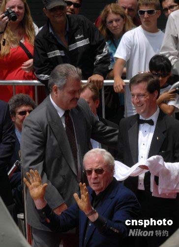 當地時間七月十一日,英國影壇老牌影星邁克爾·凱恩(Michael Caine)在著名的好萊塢中國劇院門前留下手印和腳印。邁克爾·凱恩一九六三年因出演《祖魯》而一舉成名,曾兩獲奧斯卡最佳男配角獎。凱恩主演的動作喜劇《意大利工作》被公認為英國電影的經典作品。邁克爾·凱恩出演的好萊塢新片《黑暗騎士》(DARK KNIGHT)即將在北美上映。中新社發 張煒 攝