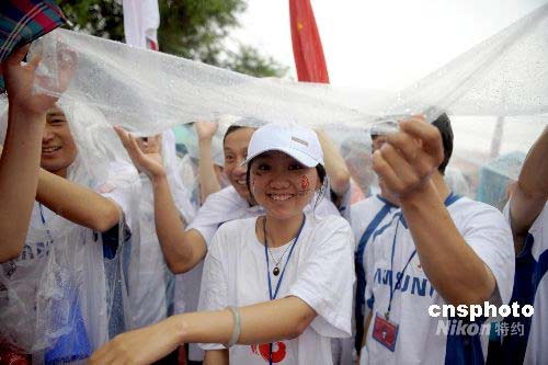 延邊大學的女大學生在雨中為北京奧運加油助威。 中新社發 廖攀 攝
