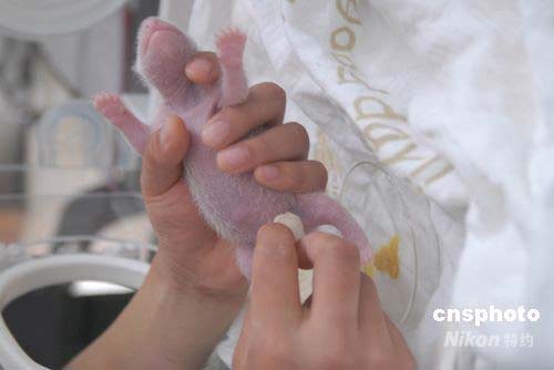 中國保護大熊貓研究中心雅安碧峰峽基地工作人員給熊貓幼仔人工排便。中新社發(fā) 羅小韻 攝