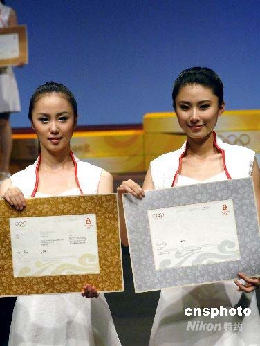 奧運禮儀志愿者展示2008北京奧運頒獎證書。中新社發 王東明 攝
