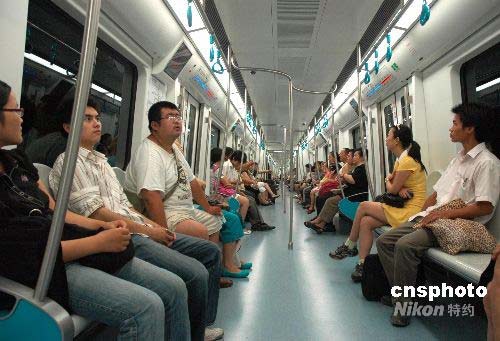 圖為地鐵10號線首次運行中車上乘客井然有序。中新社發 張雙雙 攝