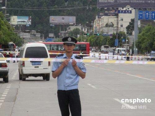 7月21日上午昆明市發(fā)生的巴士連環(huán)爆炸事件導(dǎo)致二人死亡十四人受傷,據(jù)介紹,事發(fā)車輛隸屬于昆明公交五公司,事發(fā)后五公司停止了所有公交車輛的運(yùn)行,對車場內(nèi)所有車輛進(jìn)行了細(xì)致的檢查,在對事故車輛進(jìn)行檢查時發(fā)現(xiàn),引發(fā)爆炸的物品初步懷疑為雷管狀的可疑物。圖為21日下午,公交爆炸事件車輛所屬公司逐步恢復(fù)營運(yùn)。圖為21日下午,警方仍對公交爆炸事件中的事件岷山現(xiàn)場進(jìn)行封鎖。中新社發(fā) 蔣晨 攝