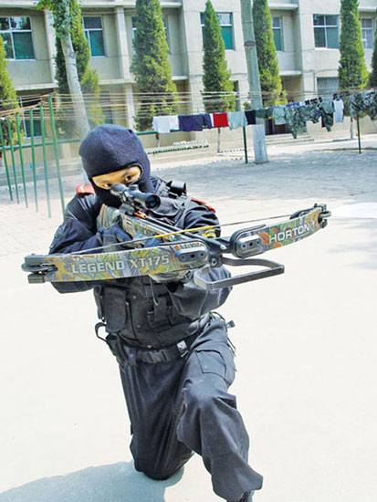 傳統(tǒng)的武器裝備在現(xiàn)代反恐中也可發(fā)揮不可替代的作用。反恐隊(duì)員手持強(qiáng)力弩弓已經(jīng)站在人體靶位的前方,一聲令下,將每個(gè)靶位上分別代表頭部和心臟的氣球立即擊碎。據(jù)了解,反恐突擊隊(duì)員使用的強(qiáng)力弩弓可穿透15厘米厚的樹木,主要用于隱蔽突擊作戰(zhàn)、解救人質(zhì),是特戰(zhàn)隊(duì)員有效的攻擊性武器。