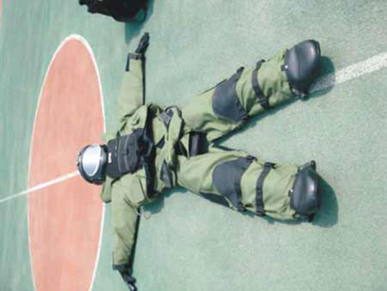 排爆服能夠防護爆炸后產生的超壓、碎片、沖擊波,對排爆專家進行全方位的保護。其頭盔里,裝有智能型電池驅動電源系統和排風系統,還有智能式聲音放大器及巨響防護裝置。排爆服“躺”在地上,就像一個人。它是目前世界上最先進的防爆服,歷經5年時間在全新平臺上研制出來,具備最新的模塊化防護組合,提供更高的防護能力。它的配置更加齊全,腕部配有頭盔遙控器,調節和控制更加方便。頭盔面罩可以掀起,頭盔上方配備高亮度發光二極管照明燈,操作更加方便。一米范圍內,500克炸藥爆炸不會危及排爆者的生命。