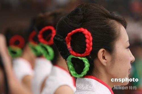 7月27日,北京奧運會的運動員之家——奧運村正式開村,來自205個國家和地區的16000名運動員和隨隊官員將逐步入住。圖為出席中國代表團升旗儀式的禮儀小姐。中新社發 武仲林 攝