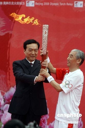 7月27日,河南省委副書記陳全國將火炬交于河南洛陽第一棒火炬手張海(右)手中,張海是當代中國書法掌門人。當日,北京奧運接力到河南省洛陽市。中新社發 慎重 攝