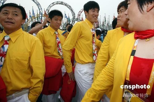 7月27日上午,北京奧運會運動員村正式開村,率先入駐的中國體育代表團舉行隆重的升旗儀式。為了“躲避”眾多志愿者、工作人員的拍攝與簽名,大明星劉翔只好隱身在田徑隊的隊友中。中新社發(fā) 任晨鳴 攝