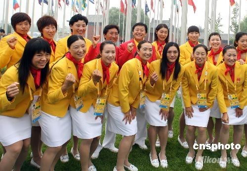 7月27日上午,北京奧運會運動員村正式開村,率先入駐的中國體育代表團舉行隆重的升旗儀式。由韓國教練金昶伯(后排左四)指教的中國女子曲棍球隊發誓要汲取雅典奧運會的教訓,向獎牌沖擊。中新社發 任晨鳴 攝