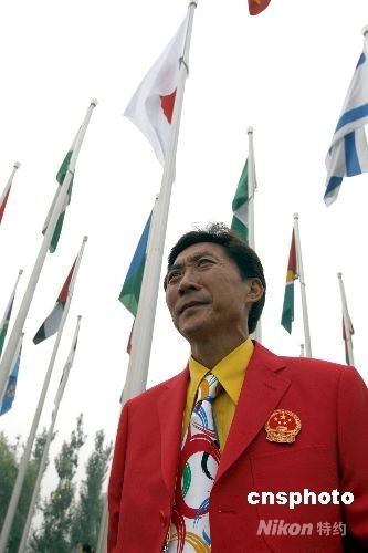 7月27日,北京奧運(yùn)村正式開村。中國女子曲棍球隊(duì)的韓國籍主教練金昶佰在奧運(yùn)村旗陣前顯得信心十足。中新社發(fā) 杜洋 攝