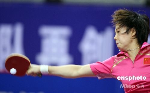 在女團比賽中,張怡寧、王楠、郭躍和李曉霞組成女一隊。圖為張怡寧在比賽中輕取對手。中新社發 盛佳鵬 攝
