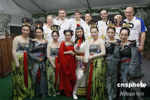 圖為英國跳水隊和奧運村茶館里的演員一起合影。 中新社發 杜洋 攝