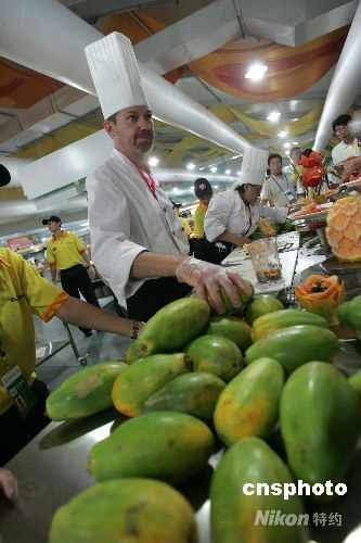 7月30日,北京奧運村的廚師在準備新鮮水果。中新社發 杜洋 攝