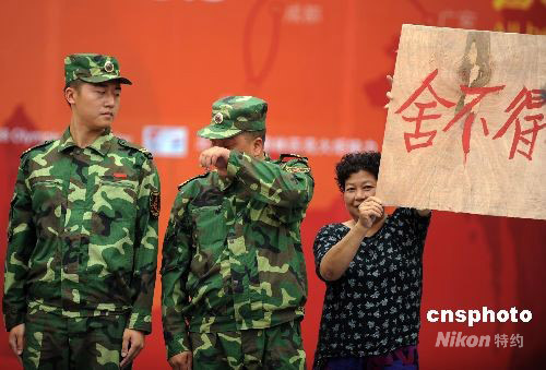 8月5日,奧運火炬在四川成都傳遞,在傳遞結束儀式上四川民眾為抗震官兵舉起“舍不得你們走”的標語,抗震官兵感動抹淚。 中新社發 廖攀 攝