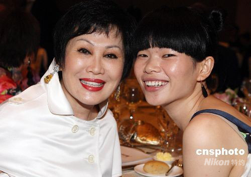 圖為美籍華人靳羽西與中國模特呂燕亮相北京突尼斯旅游文化周。 中新社發 錢興強 攝
