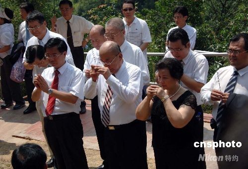 八月十四日,中國國民黨主席吳伯雄回到祖籍地--福建永定縣下洋鎮思賢村,前往祖墳祭拜祖先。圖為吳伯雄夫婦一行向祖墳上香。中新社發 鄭祚聲 攝