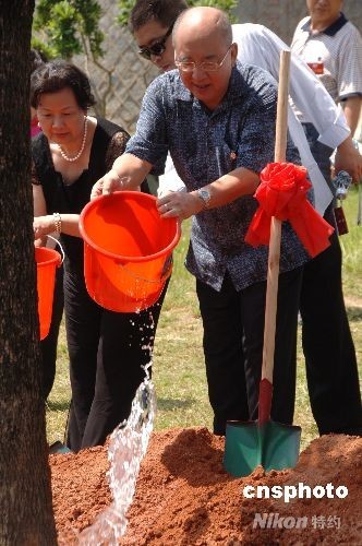 八月十四日下午,中國國民黨主席吳伯雄一行在福建永定縣高北土樓群的“土樓王”承啟樓前,植樹紀念此次祖地行。圖為吳伯雄夫婦為新種下的香樟樹澆水。中新社發(fā) 鄭祚聲 攝