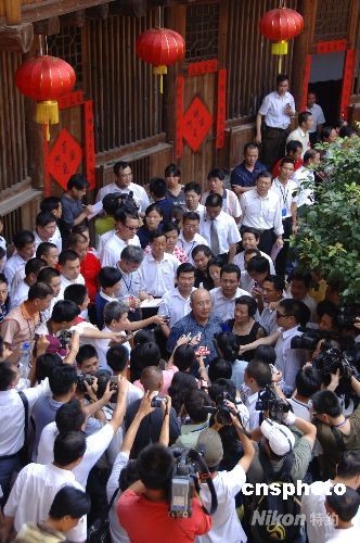 八月十四日下午,中國國民黨主席吳伯雄來到福建永定縣的高北土樓群參觀游覽,眾多記者一路追隨采訪。中新社發 鄭祚聲 攝