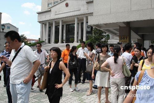 8月26日,上海第二中級法院電子信息牌上公告,轟動滬上的“楊佳襲警案”將在下午一點開庭。眾媒體被謝絕現場旁聽,許多媒體記者在法院門口觀望采訪。今年7月1日,北京籍男子楊佳闖入上海市閘北區政法辦公大樓,連續捅傷9名民警和一名保安,并致其中6名警察身亡,楊佳被當場擒獲。中新社發 潘索菲 攝